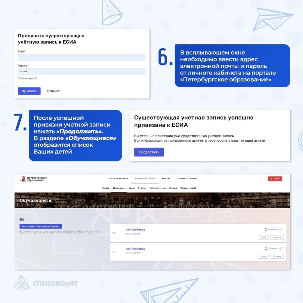 Что делать после входа через ЕСИА в вашем личном кабинете на портале «Петербургское образование» для отображения информации о детях и как предоставить доступ к «Электронному дневнику» своему ребёнку – в карточках ниже